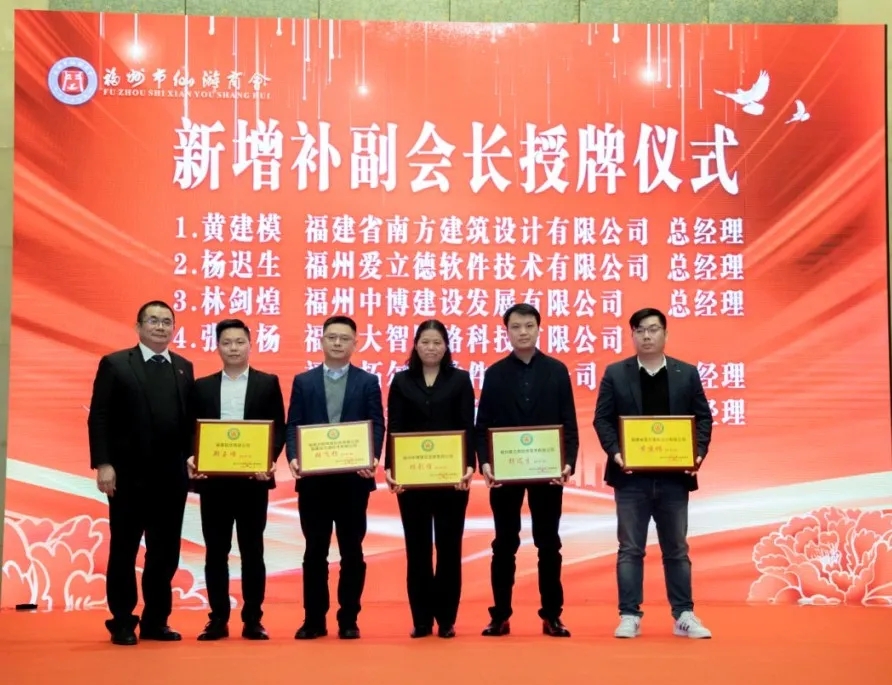 郭建濤會(huì)長向新增補(bǔ)的副會(huì)長黃建模、楊遲生、林劍煌、張飛楊、鄭玉峰授牌