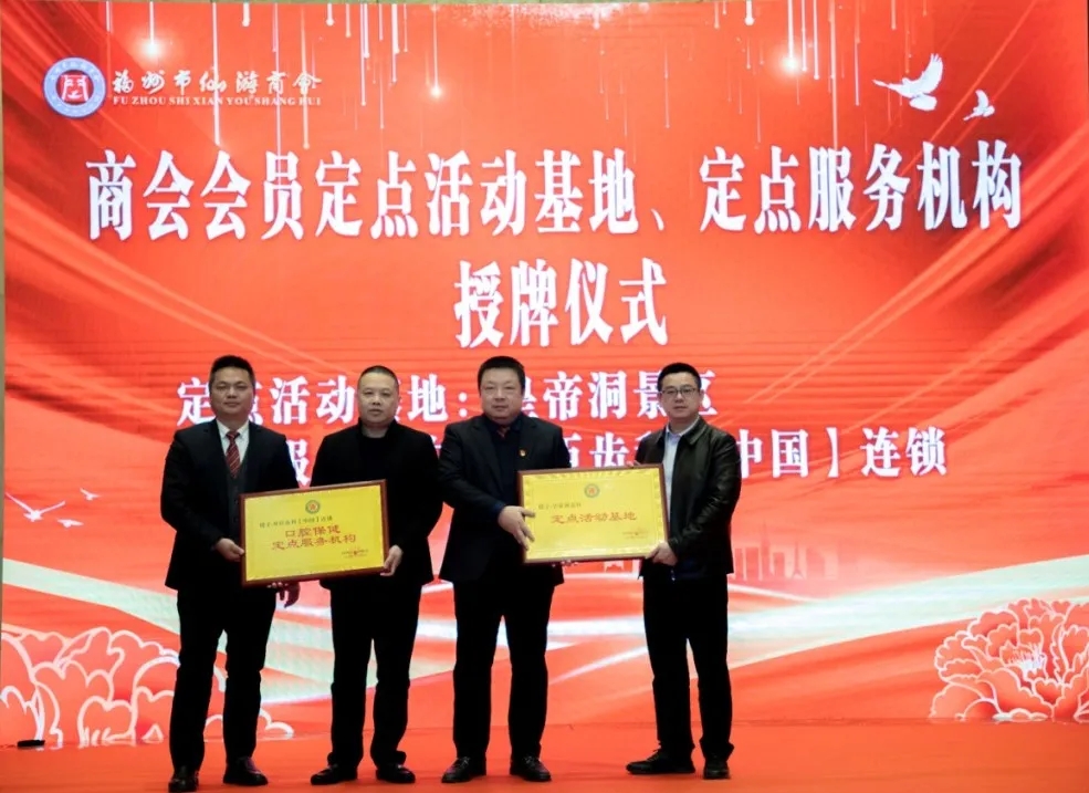 楊鋒監(jiān)事長、羅文棟執(zhí)行會(huì)長分別向商會(huì)會(huì)員定點(diǎn)活動(dòng)基地皇帝洞景區(qū)、定點(diǎn)服務(wù)機(jī)構(gòu)貝臣齒科【中國】連鎖授牌